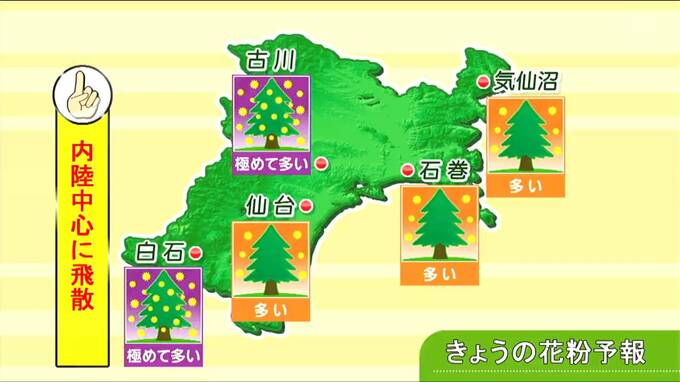 花粉については、今日は東風が流れ込みやすい気象条件のため、内陸を中心に飛散量が多くなると予想されています。古川・白石・仙台・石巻・気仙沼のいずれも「極めて多い」または「多い」水準となる見込みで、外出時はマスクの着用など対策を万全にしてください。