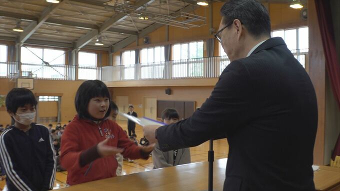 甲府市の石田小学校では1年生から5年生まで およそ200人の児童が体育館に集まり、各学年の代表が中込繁樹校長から修了証書を受け取りました。