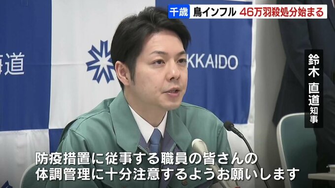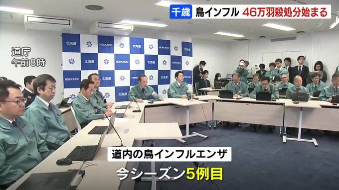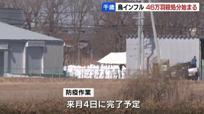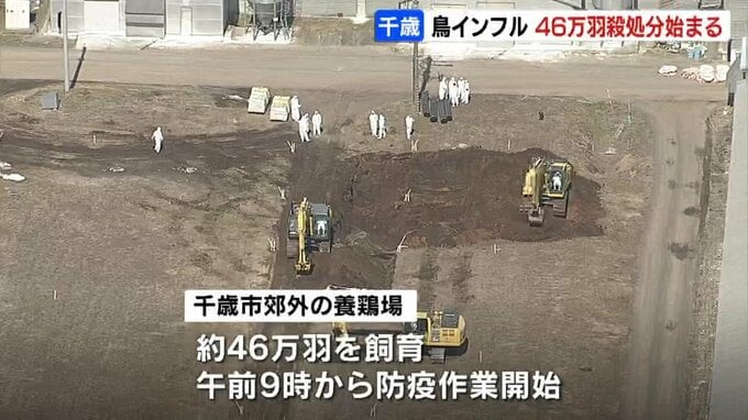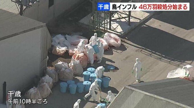 北海道千歳市の養鶏場で高病原性鳥インフルエンザが発生し、道は25日朝から46万羽のニワトリの殺処分を始めました。