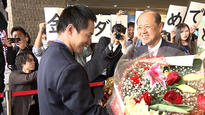 岡山市役所を訪れた木村葵来選手を多くの職員や大森市長が出迎えました。木村選手は、先月の冬季五輪スノーボード男子ビッグエアで日本人初の金メダルを獲得しました。岡山市出身の選手として初の冬季五輪金メダルという偉業をたたえ、岡山市民スポーツ栄誉賞が贈られました。