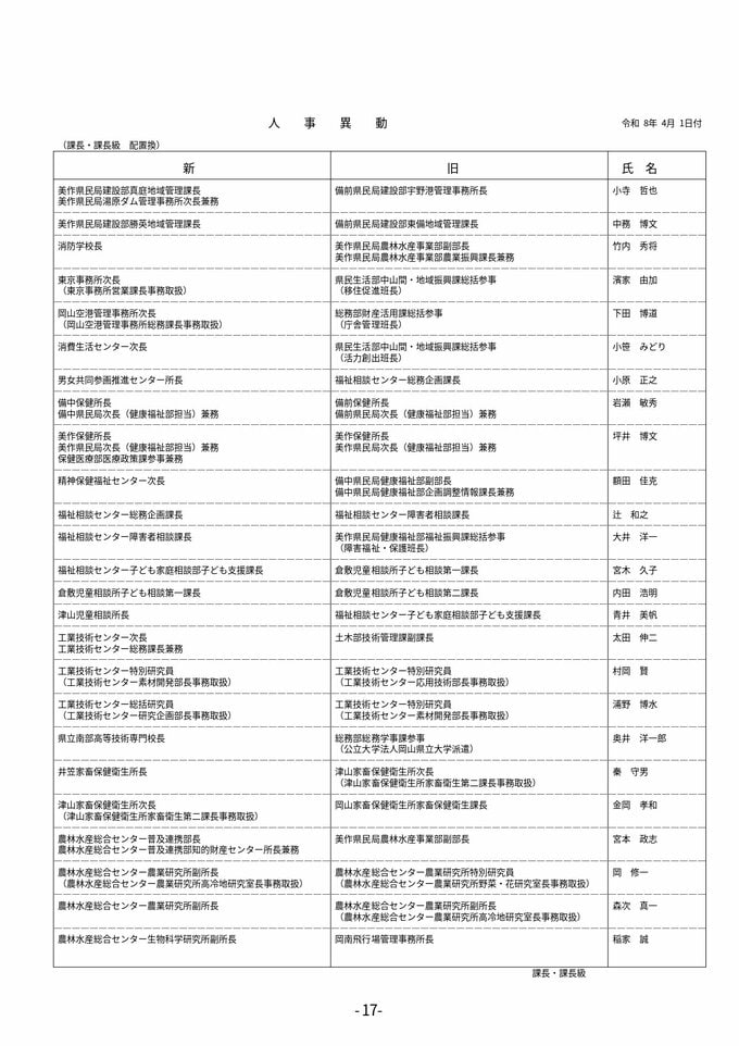 【2026年4月】岡山県職員 第2次人事異動 主管課長・主管課長級(昇任・配置換え)退職者など【画像一覧掲載】