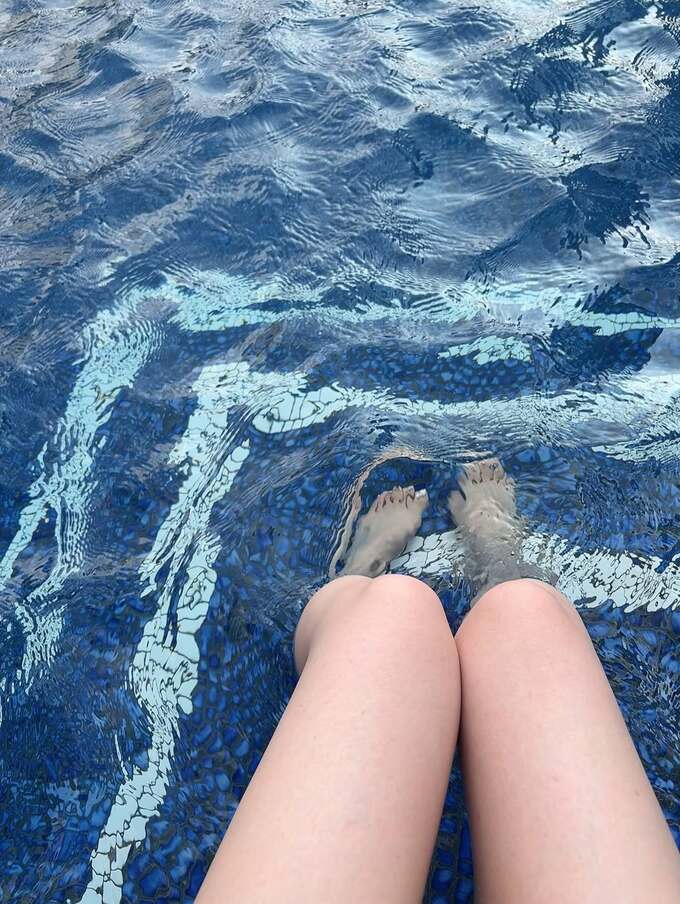 また、プールに足を浸した写真も公開。日光を反射してきらめく水面と青いモザイクタイルが印象的な一枚となっています。
