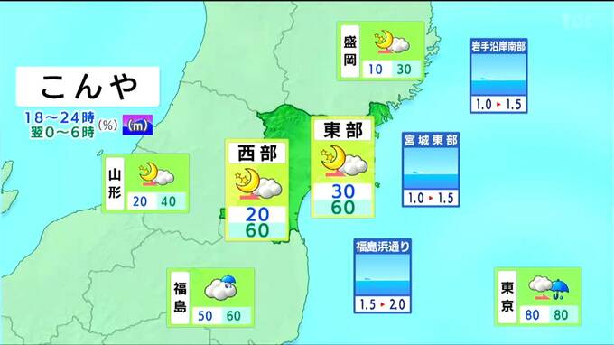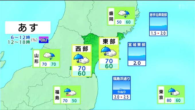 長い時間に渡って雨が降るでしょう。降り方は弱いものの、傘が手放せない天気となりそうです。海上の波の高さは2メートルの予想です。