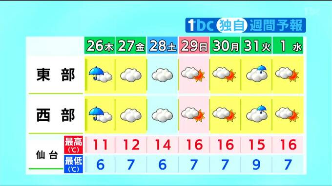 最低気温は、25日朝より3℃から7℃高く、4月上旬から中旬並みでしょう。最高気温は、25日より1℃から4℃低く平年並みとなりそうです。