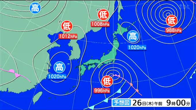 26日午前9時の予想天気図です。発達した低気圧が伊豆諸島付近を東に進むでしょう。県内は湿った空気が流れ込みやすくなりそうです。