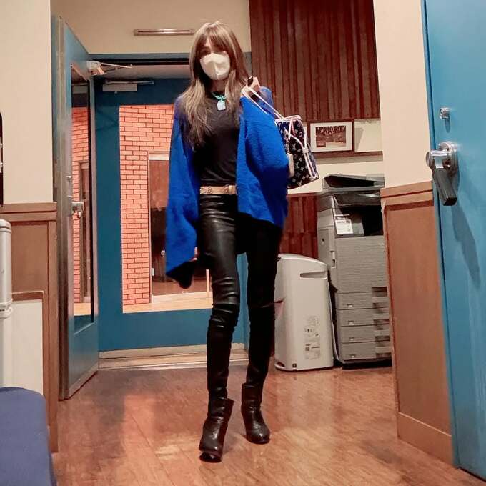 投稿された画像の工藤さんは、黒のトップスに青いカーディガンを羽織り、黒のレザーパンツにショートブーツというコーディネイト。