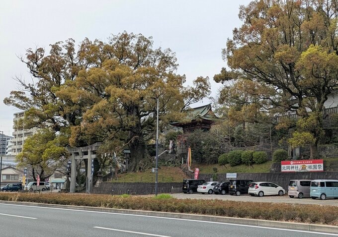 「祇園町」は、近くにある北岡神社が元来「祇園社」と呼ばれていたことにちなんでいます。北岡神社には京都の祇園社(八坂神社)の分霊がまつられていて、「八坂町」もここから採られたのだと思われます。花岡山も、江戸時代までは「祇園山」とよばれていたそうです。