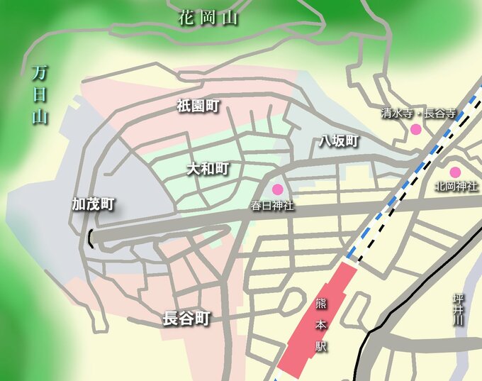 さて、1891年(明治24年)に熊本駅が開業した当時、駅舎が飽託郡春日村にあったことから、市民からは「春日ステンショ(ステーション)」と呼ばれていたそうです。写真手前の住宅地は現在春日3丁目~5丁目にあたりますが、1969年(昭和44年)の町名改正以前は、ここには奈良や京都のような雅(みやび)な町名がついていました。