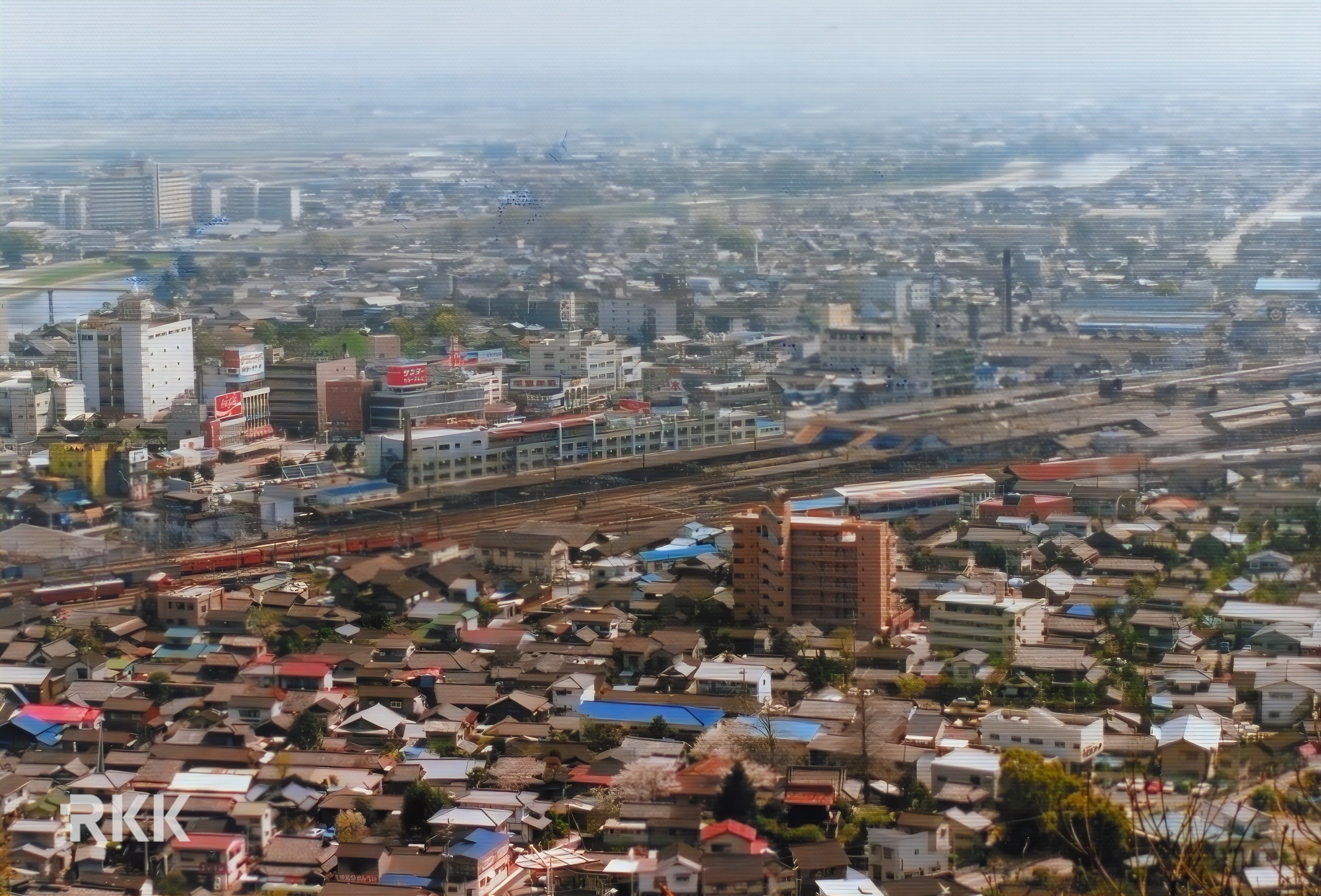 駅の北側にある花岡山から見た熊本駅の全景です。今はこちら側に「新幹線口」があります。撮影日時は残されていませんが、写真左端、白川の対岸に見える「世安町団地」は1979年竣工なので、1980年代前半頃の撮影だと思われます。