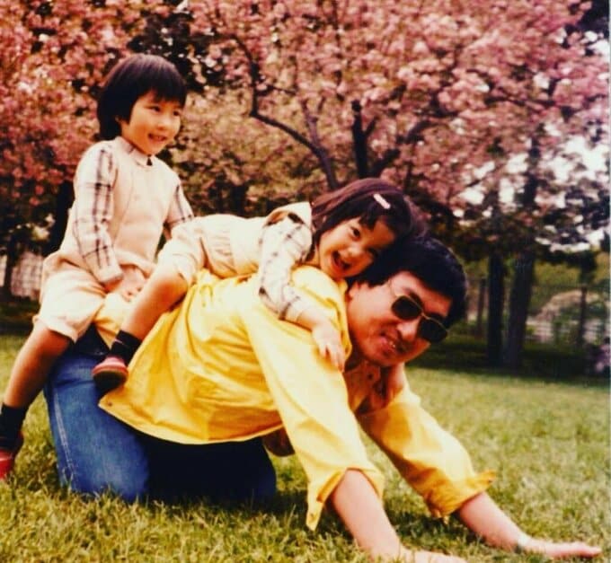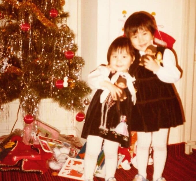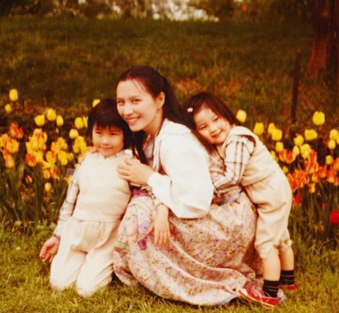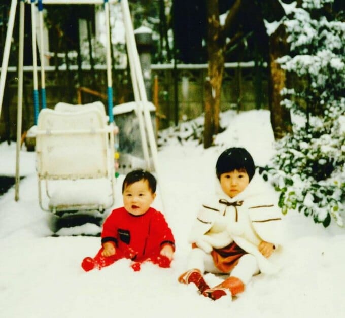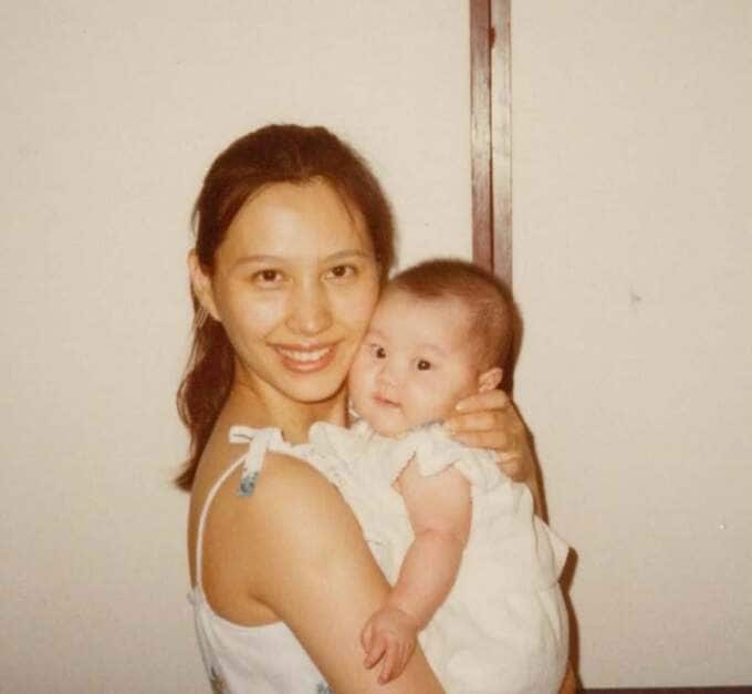 投稿には「母と私」と題した幼少期の家族写真が複数枚添えられており、雪の庭で姉と並ぶ写真や、クリスマスツリーの前で姉とポーズをとるショット、桜咲く公園で父親と遊ぶ場面、黄色いチューリップ畑で母親と姉妹3人が寄り添う写真など、温かな家族の記録が並びました。