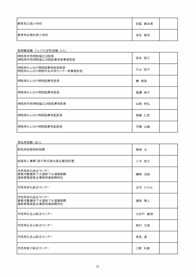 【2026年4月】高松市職員 人事異動 局長級・局次長級(昇任・採用)退職者など【画像一覧掲載】 RSK山陽放送 2026年3月26日(木) 12:13 国内 医師職・再任用 退職など 【名簿一覧を見る】 【名簿一覧を見る】 ▶【画像一覧掲載】高松市職員 人事異動 局長級・局次長級(昇任・配置換え)退職者など