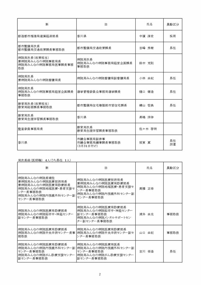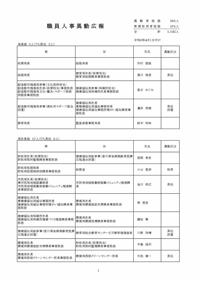 【2026年4月】高松市職員 人事異動 局長級・局次長級(昇任・採用)退職者など【画像一覧掲載】 RSK山陽放送 2026年3月26日(木) 12:13 国内 局長級・局次長級 【名簿一覧を見る】 【名簿一覧を見る】