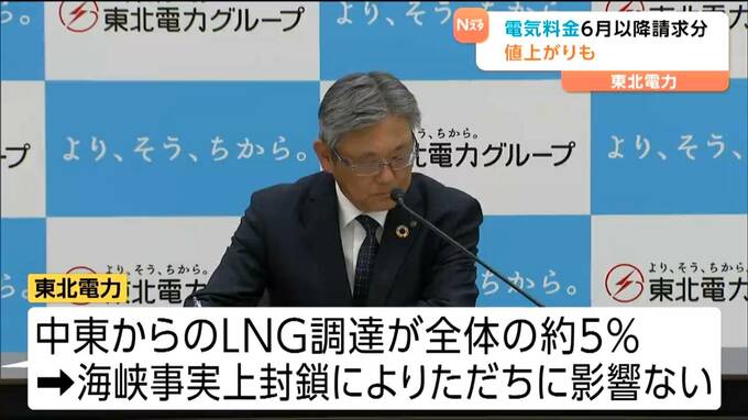 電気料金について値上がりの懸念が出ています。東北電力の石山一弘社長は、イランでの戦闘が長期化した場合、6月以降に請求する電気料金が値上がりする可能性があるとの見方を示しました。