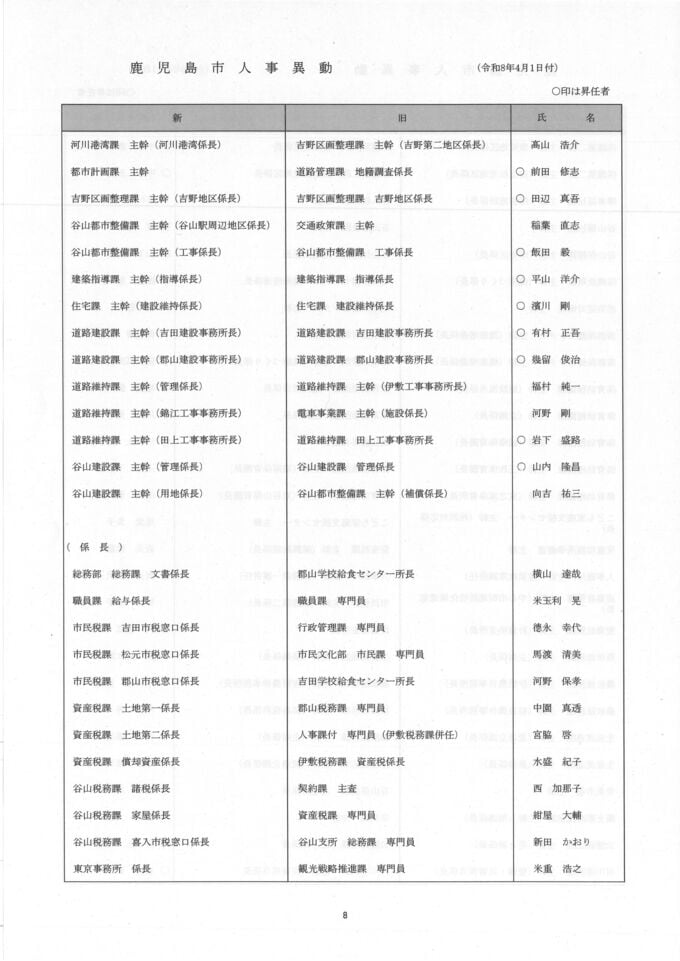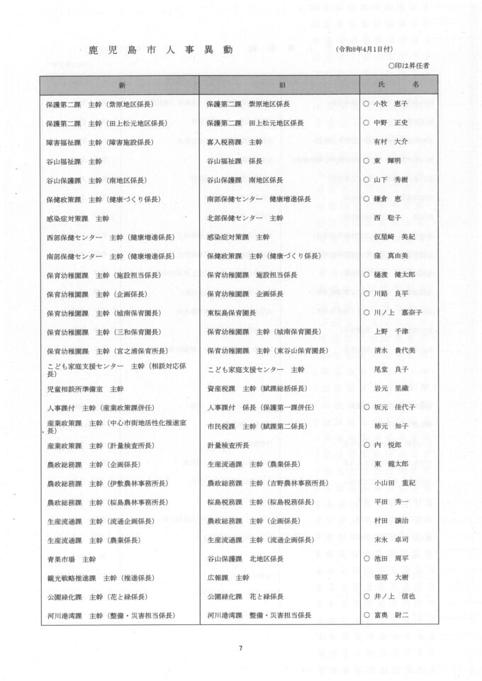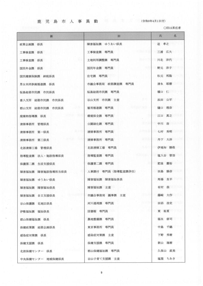 鹿児島市人事異動一覧【異動名簿】鹿児島市役所2026