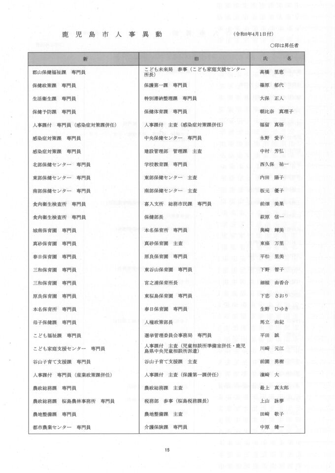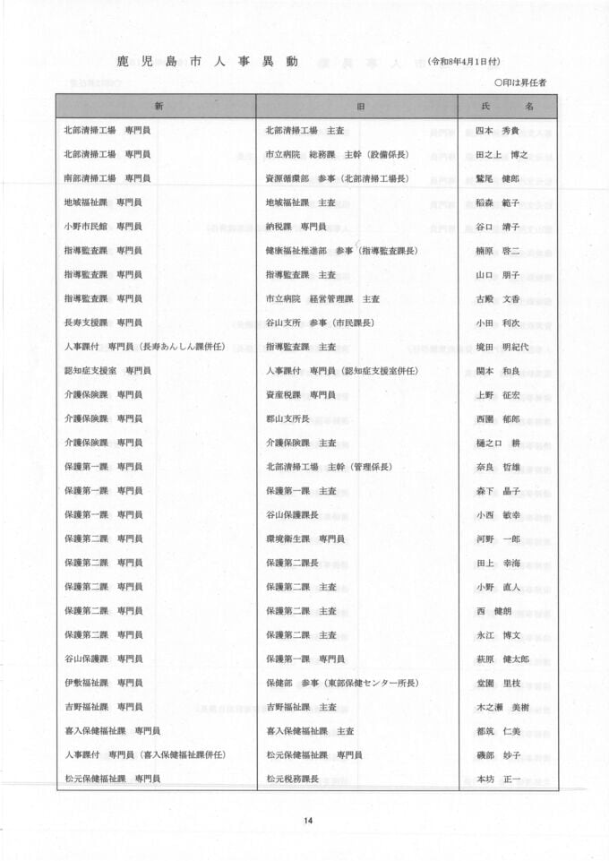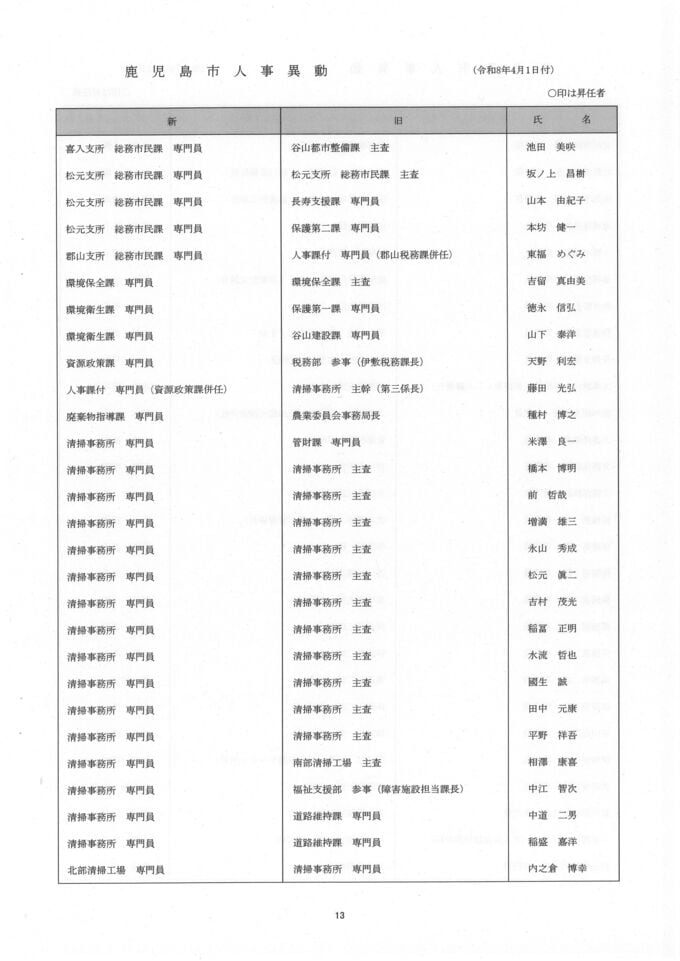 鹿児島市人事異動一覧【異動名簿】鹿児島市役所2026
