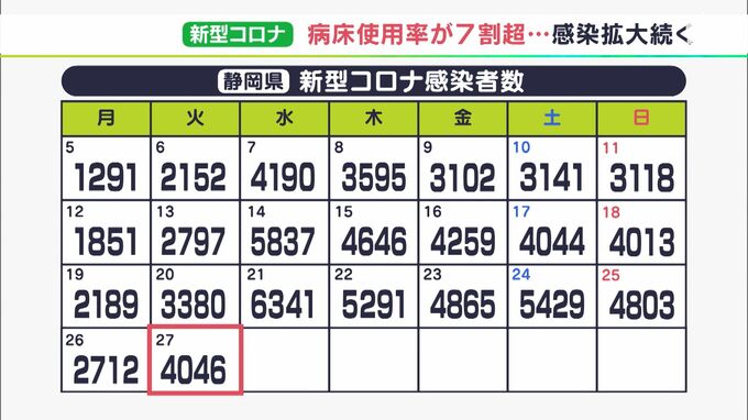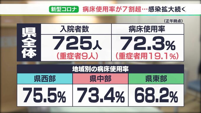 病床使用率は中部と西部で7割を超えていて、静岡県全体でも72.3%と高水準を記録しています。また、重症患者の病床使用率も2割近くに達するなど患者の増加が反映された結果になっています。