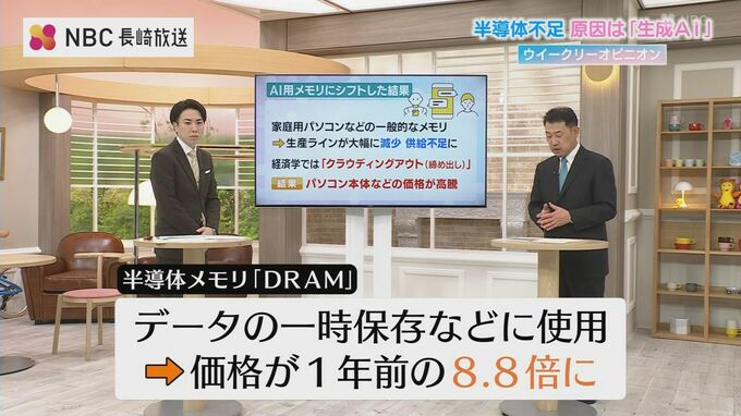 一部報道では、データの一時保存に使われる「DRAM」と呼ばれる半導体メモリの価格が1年前の8.8倍になったということも報じられました。実際にどの程度値上がりしているのか、オフィス機器などを扱う長崎市の企業に話を聞きました。
