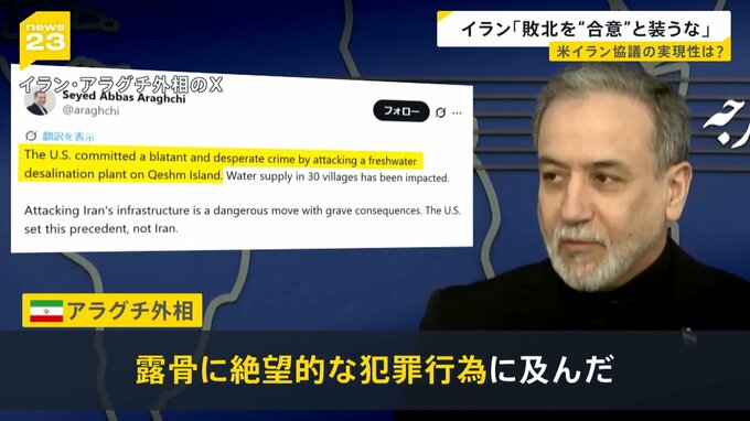 イランのアラグチ外相は、海水の淡水化施設がアメリカの攻撃を受け、30の村で水の供給に影響が出たと明らかにしました。
