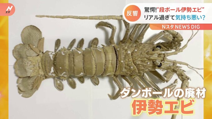 動きだしそうなほどリアルな伊勢エビ。実はダンボールで作られた細かすぎるアート作品です。
