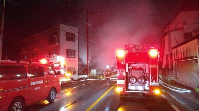 消防が消火にあたりましたが、火は、近藤英樹さん(70)の木造瓦葺き2階建て住宅、約50平方メートルと警備員の髙蓋辰登さんの木造瓦葺き2階建て住宅、約60平方メートルを全焼し、約3時間半後に消し止められました。