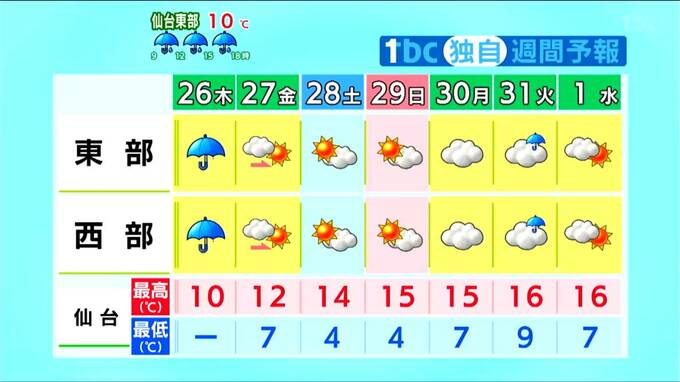 一方、来週31日(火)は低気圧や前線の影響で再び雨が降るおそれがあり、楽天イーグルスのホーム開幕戦への影響が心配されます。気温は平年より高い日が多くなる見込みです。