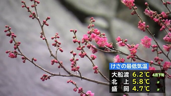 今朝の最低気温は、一番高かった大船渡で6.2度、北上で5.8度と寒さが緩み、4月中旬から下旬並みのところが多くなりました。