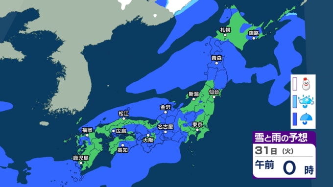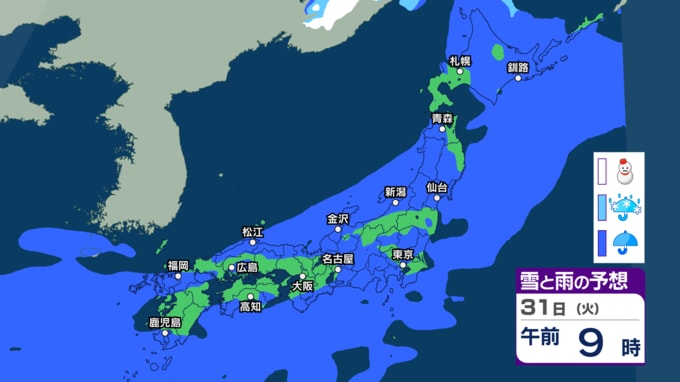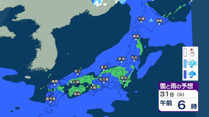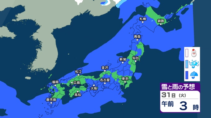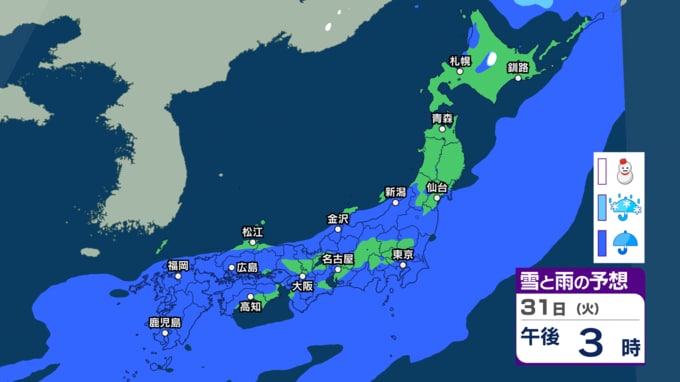 きょう26日は関東や東北で雨に 来週30日(月)~31日(火)も低気圧通過で西日本~東日本の広い範囲で雨の予想【今後の雨・雪のシミュレーション・26日正午更新】 新潟放送 2026年3月26日(木) 12:05 31日(火)午前0時~午後3時の雨と雪のシミュレーション