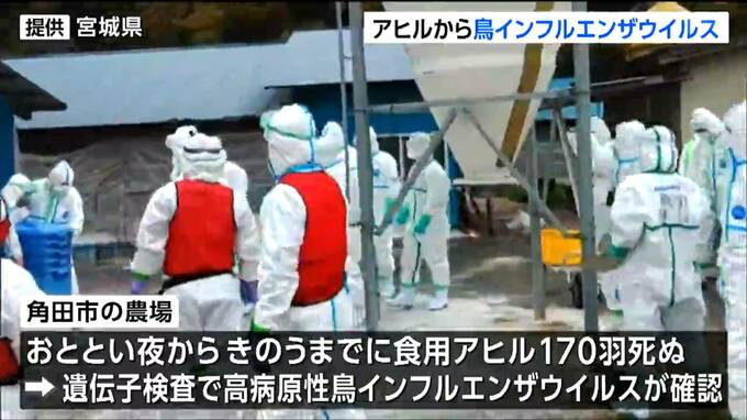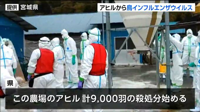 宮城県によりますと、角田市の農場で24日夜から25日までに食用のアヒル170羽が死んでいました。遺伝子検査の結果、26日朝、高病原性鳥インフルエンザのウイルスが確認されました。これを受けて県は、午前9時からこの農場のアヒルあわせて9000羽の殺処分を始めました。