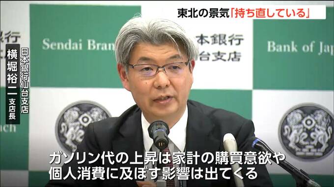 定例会見で日銀仙台支店の横堀裕二支店長は、東北の景気について「持ち直している」との判断を15か月連続で据え置きました。物価高による節約志向は続いているものの、雇用や賃金の改善を背景に一定の消費活動は続いているとして、個人消費についても「緩やかに回復している」との判断を継続しています。