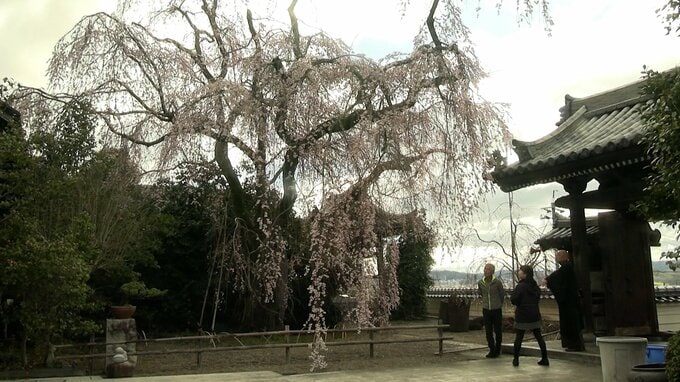淡いピンク色の花が空から降り注ぐように咲き誇っています。高さ15メートル、樹齢は150年以上いわれる千光寺の名物、シダレザクラです。例年より5日ほど早い今月21日に開花し、満開となっています。きのう(25日)からはライトアップが始まり、日中とは趣きの異なる幻想的な姿が楽しめるということです。