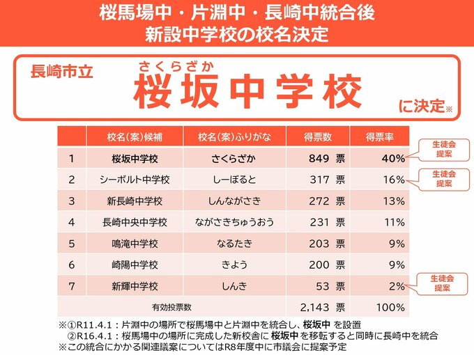 この「桜坂」という名称は、生徒から提案された案が採用された形となります。(※ちなみに、得票数2位は生徒会提案の「シーボルト中学校」で317票、3位は「新長崎中学校」で272票でした。)