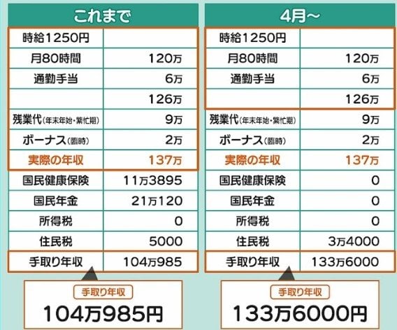 残業代やボーナスなどを含んだ実際の年収は137万円ですが、ベースが126万円で130万円以下なので、社会保険料は支払わなくていいということになります。