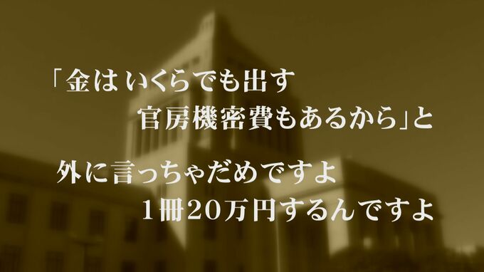 「(安倍氏から)『金はいくらでも出す。官房機密費もあるから』と。外に言っちゃだめですよ。1冊20万円するんですよ」