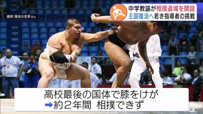 菊池さんは、木造高校相撲部時代に世界ジュニア選手権で団体優勝を果たすなど好成績を挙げたものの、高校最後の国体で膝を大けがしてその後、2年間相撲ができなくなりました。