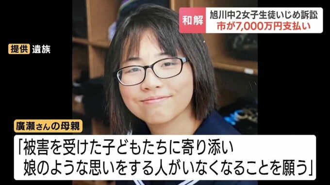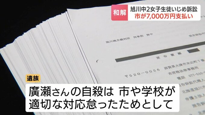 5年前、北海道旭川市でいじめを受けていた女子中学生が自殺し、遺族が旭川市に損害賠償を求めていた裁判は、市が遺族に7000万円を支払うことなどで26日和解が成立しました。