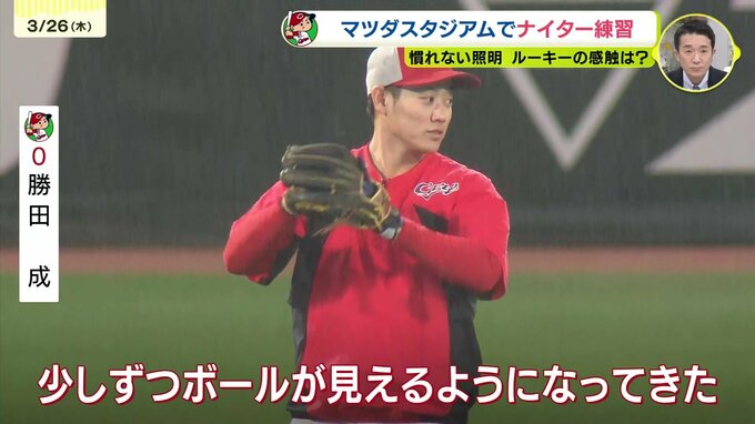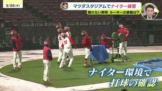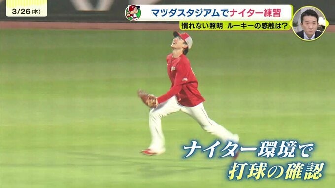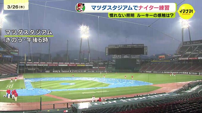 カープ開幕戦はナイターです。ルーキーにとっては慣れない照明の下でのプレーとなります。25日にはマツダスタジアムで今季初となるナイター練習がありました。
