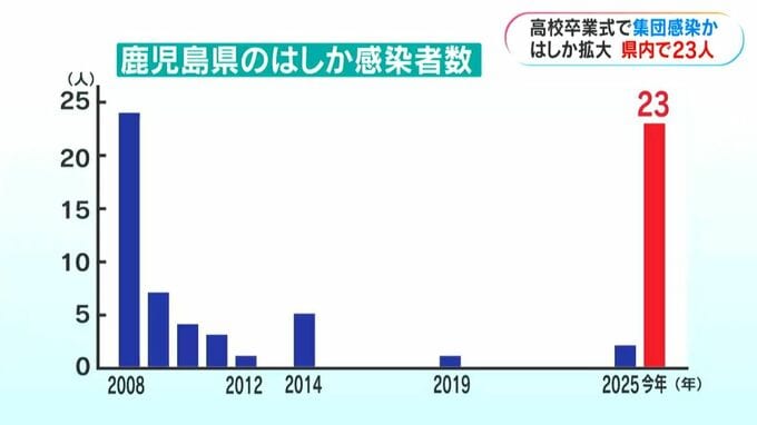 鹿児島県内で「はしか」の感染が広がっています。きょう3月26日までに23人の感染が確認され、このうち13人は高校の卒業式で集団感染したとみられています。