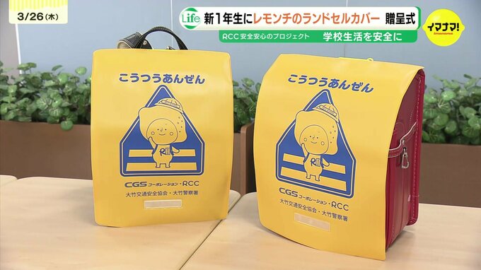 この春、小学校に入学する新1年生の安全を守ろうと、黄色いランドセルカバーの贈呈式が、広島県大竹市でありました。贈呈式では、RCCと警備会社のCGSコーポレーション、そして地元の交通安全協会から、大竹市の小…