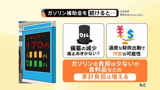 ガソリン補助金で継続してガソリン価格を抑えるとなると、どんなことが起きるのか、日本総研の栂野裕貴研究員に聞きました。