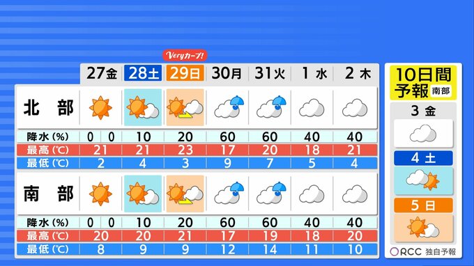 この先は周期的な天気変化になる見込みです。週末はおおむね晴れてまずまずの行楽日和になるでしょう。日中の気温は平年を上回る日が多く、20℃を超える日もある予想です。特に日曜日は4月下旬~5月上旬並の季節先取りの暖かさになるでしょう。月曜日、火曜日はまとまった雨になる見込みです。春本番の陽気が続きますが、北部や内陸部を中心に一日の寒暖差が大きいため、体調管理にはご注意ください。