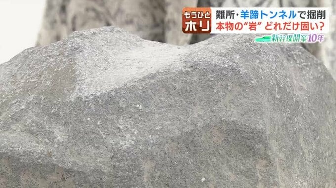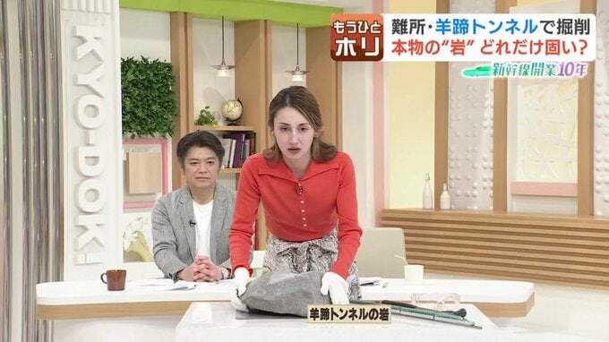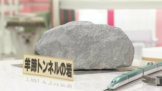 スタジオにご用意しましたこちらが、羊蹄トンネルの工事現場で掘削を阻んでいた、岩そのものです。本物です。直径35センチの安山岩と呼ばれる種類でして、大きいものだと幅2メートルにもなるということなんですね。建設を担う鉄道・運輸機構から実際に借りてきました。ヒ素などの有害物質は含まれていないので安心してください。じゃあ、10周年の節目です、触ってください。