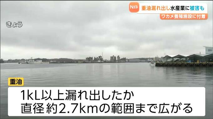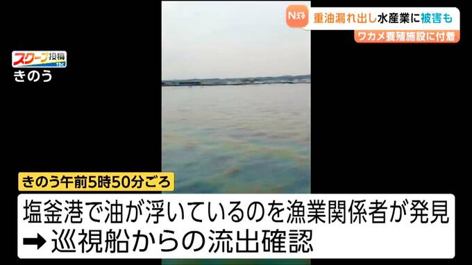 宮城県塩釜港で海上保安部の巡視船から重油が漏れ出しました。周辺の海域では油を取り除く作業が続いていますが、刈り取りの時期を迎えたワカメの養殖施設に油が付着するなど水産業へ被害が出ています。