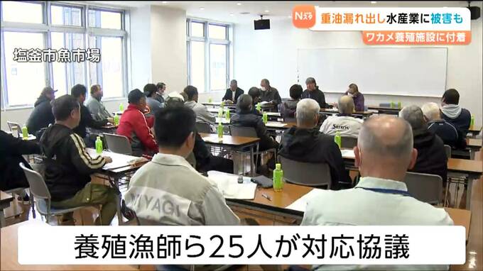 また、約5キロ離れた貞山堀にはオイルフェンスが設置され、船の航行が制限されています。油が広がったなかには養殖ワカメの漁場も含まれることから、26日に養殖を行う漁師ら25人が集まり今後の対応を協議しました。これまでに養殖施設への油の付着が確認されていて、引き上げる際にワカメに付着する恐れがあるということです。ワカメに油が付着すると出荷できなくなるため、処分する可能性が高いということです。