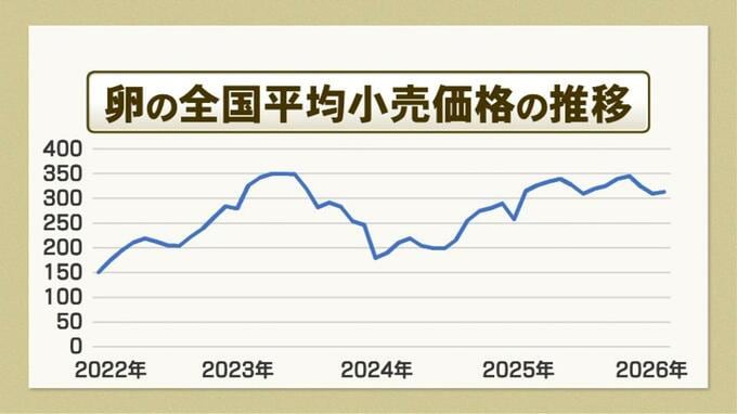 長年価格が安定し、物価の優等生とされてきた鶏卵。しかし今、高止まりが続いています。200円以下が普通だったのも今は昔。約3年前から上昇し始めた全国平均の小売り価格は、最近は300円台で推移しています。