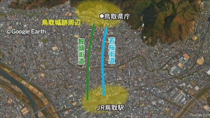 鳥取市が進める中心市街地の活性化計画の中心は駅周辺と鳥取城跡周辺で、その2つの核をつなぐ「若桜街道」と「智頭街道」を軸とする「二核二軸」です。