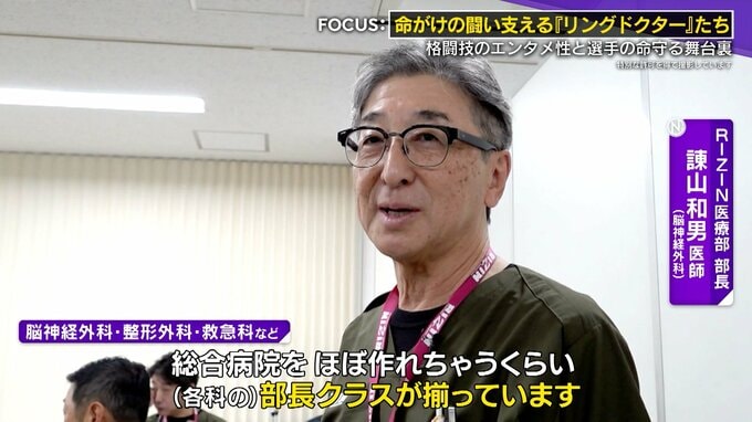 2025年12月31日―4万5000人もの観客を熱狂させたのは、日本最大級の格闘技イベント『RIZIN』。激しい攻撃が特徴で、けがが多いラグビーと比べても発生率は30倍とも言われるが…大会設立から10年経つ今も命に関わるけがはゼロ!その背景にはリングドクターたちの存在があった。『RIZIN医療部』を率いるのは、脳神経外科医の諫山和男医師。各病院から集まった格闘技好きの一流医師たちが試合に目を光らせる。その“裏側”に密着取材、ドクターたちの迅速な処置や、『ドクターストップ』の葛藤に迫った。