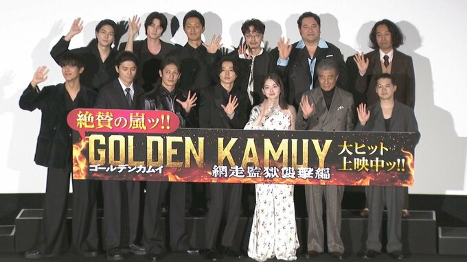 山﨑賢人さん、山田杏奈さん、眞栄田郷敦さん、矢本悠馬さん、中川大志さん、工藤阿須加さん、栁俊太郎さん、稲葉友さん、和田聰宏さん、勝矢さん、玉木宏さん、舘ひろしさん、片桐健滋監督の13名が、「映画『ゴールデンカムイ 網走監獄襲撃編』大ヒット御礼舞台挨拶」に登壇しました。