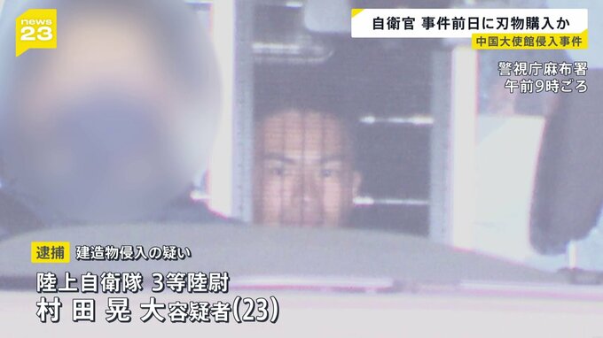陸上自衛官の男が中国大使館に侵入したとして逮捕された事件。男が前日に都内の量販店で刃物を購入したとみられることがわかりました。26日朝に送検された陸上自衛隊の3等陸尉・村田晃大容疑者はおととい、東京・…