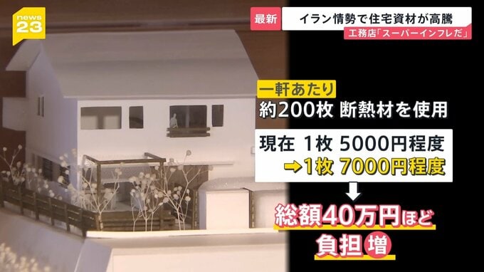 断熱材の製造会社は4月から、販売価格を40%引き上げると発表。工務店の代表によりますと、一般的な住宅では、一軒あたり約200枚の断熱材を使用します。現在の価格は1枚あたり5000円程度で、値上がりすると、総額40万円ほど負担が増える計算になります。