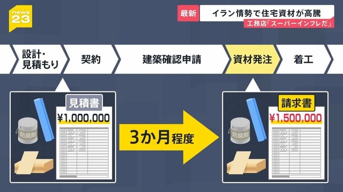 家を建てる際、工務店側は顧客の注文を受けて作成した見積もりをもとに契約を行います。ただ、資材を発注する前に行政への申請が必要で、許可が下りるまで3か月程度かかるといいます。この間に、資材の仕入れ価格が大きく値上がりする可能性があるというのです。